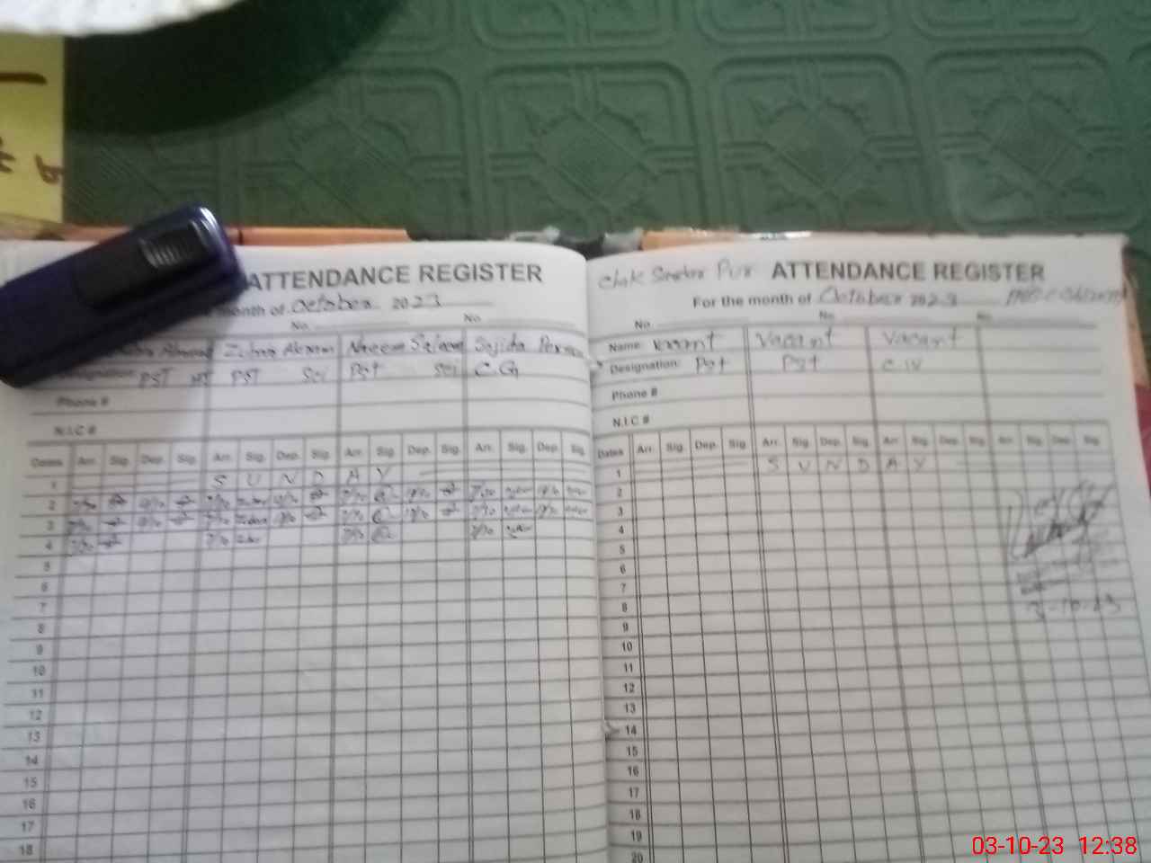 | CNIC | Full Name | Designation | R/C | Absence During Last Calender Month |
