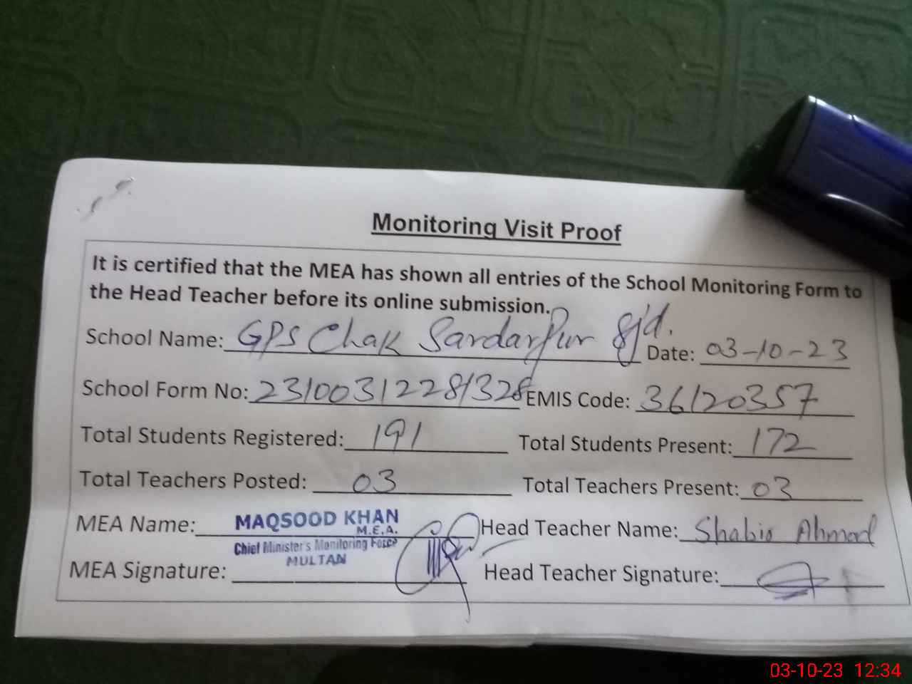 | Name: SH**** AH**** Designation: (School Headmaster's/Headmistress's) PST Phone/Cell Number: 03**** |