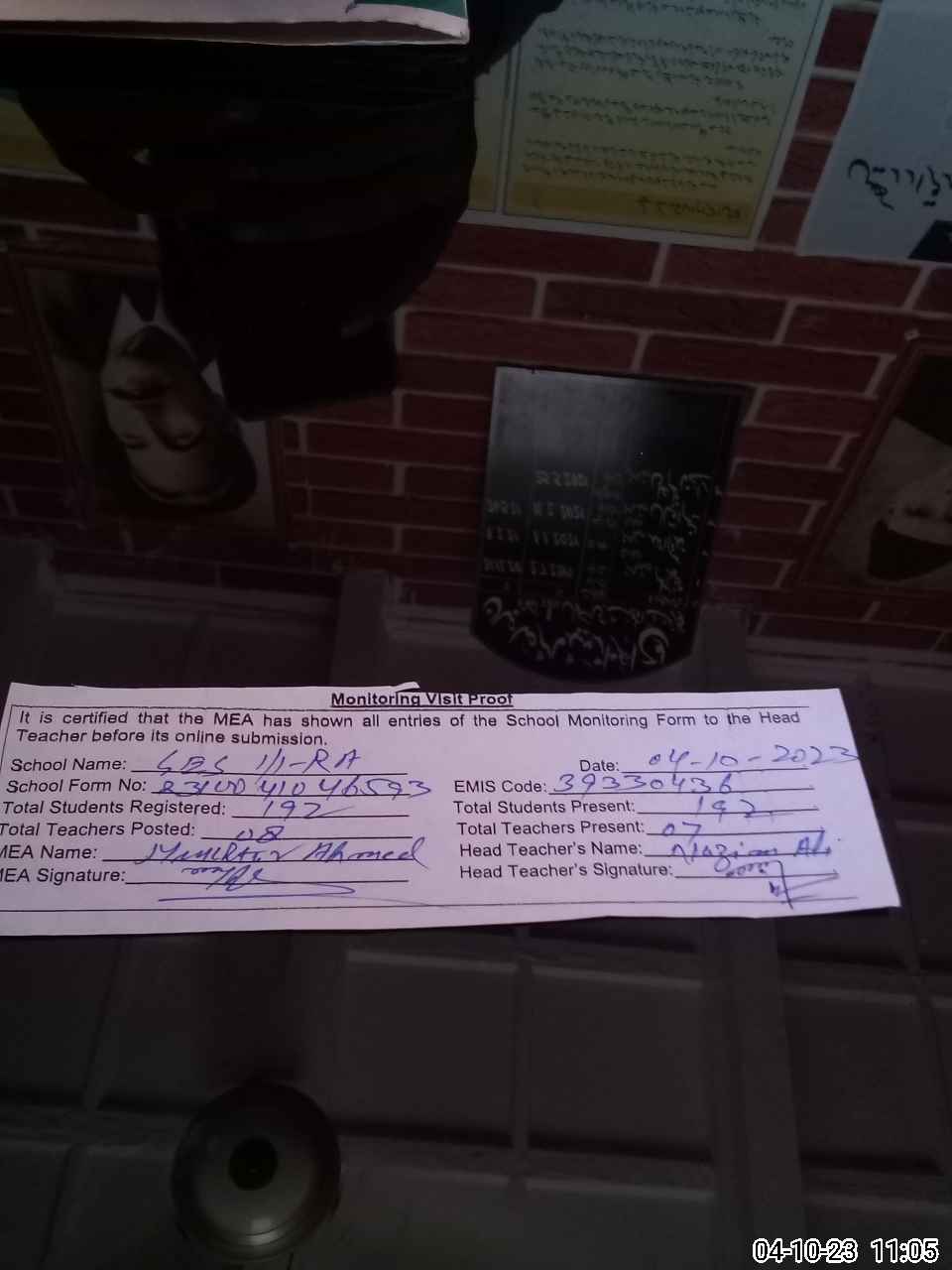| Attendance Register | Head Teacher | MEA with School | Visit Proof |