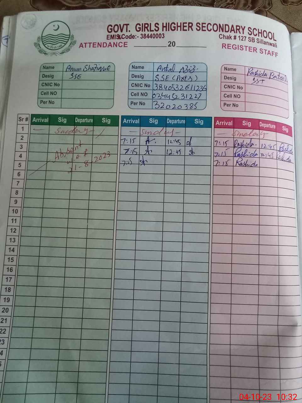 | Name: SA**** IR**** Designation: (School Headmaster's/Headmistress's) I/C PRINCIPAL Phone/Cell Number: 03**** |