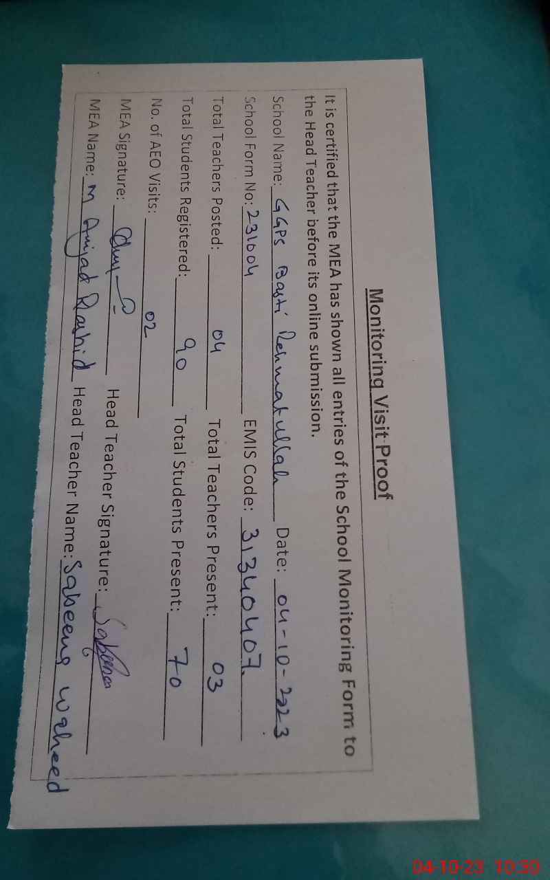 | Attendance Register | Head Teacher | MEA with School | Visit Proof |