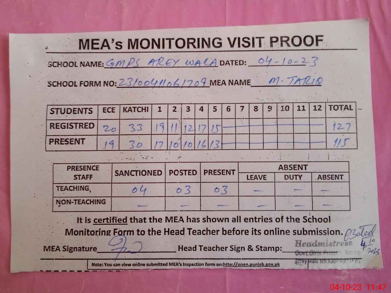 | Attendance Register | Head Teacher | MEA with School | Visit Proof |