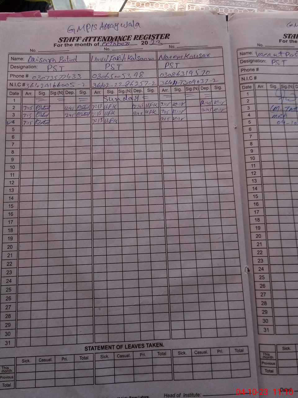 | Name: SA**** NO**** Designation: (School Headmaster's/Headmistress's) PST Phone/Cell Number: 03**** |
