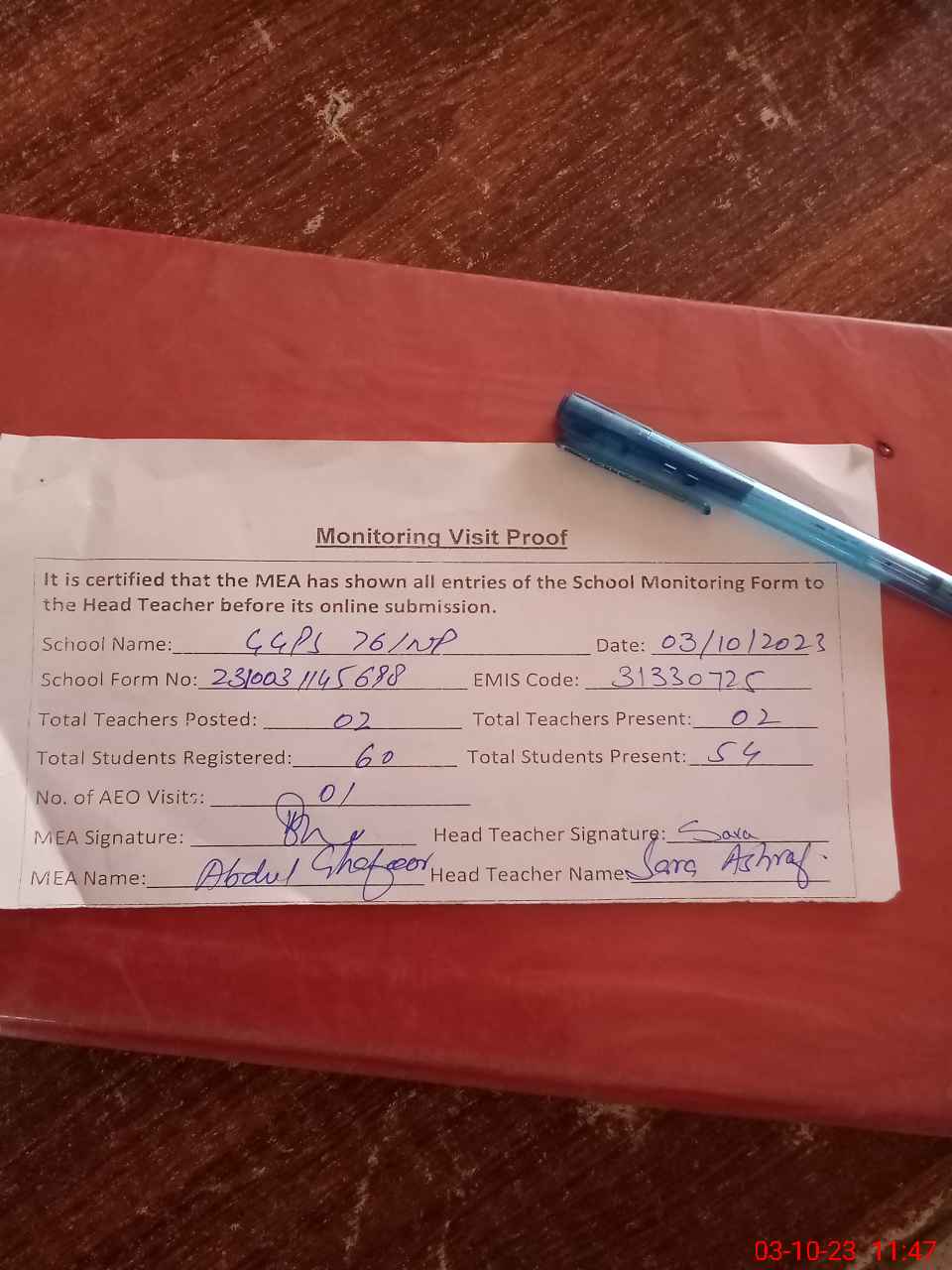 | Attendance Register | Head Teacher | MEA with School | Visit Proof |