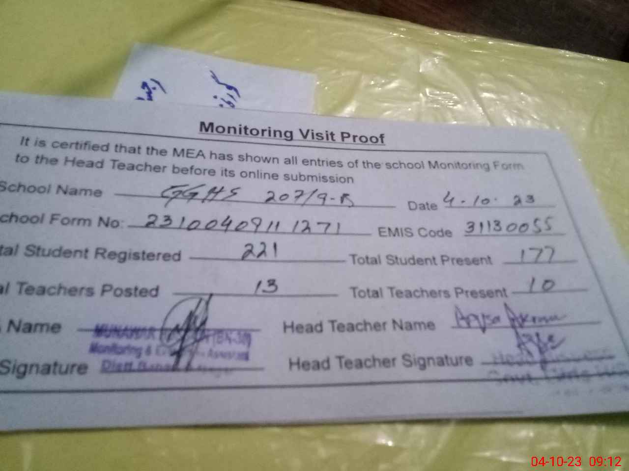 | Attendance Register | Head Teacher | MEA with School | Visit Proof |