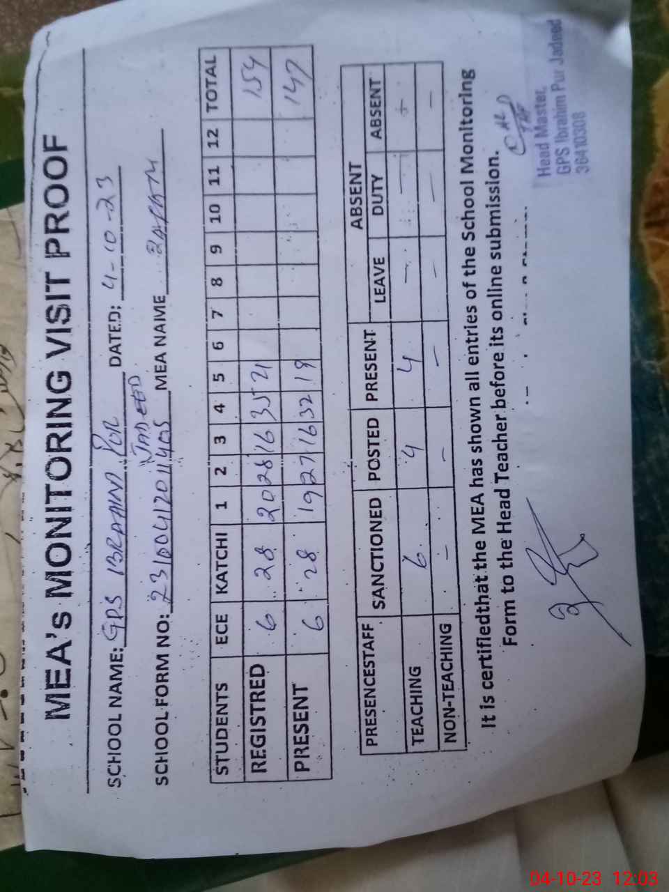| Attendance Register | Head Teacher | MEA with School | Visit Proof |