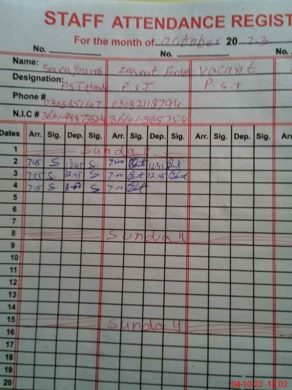 | CNIC | Full Name | Designation | R/C | Absence During Last Calender Month |