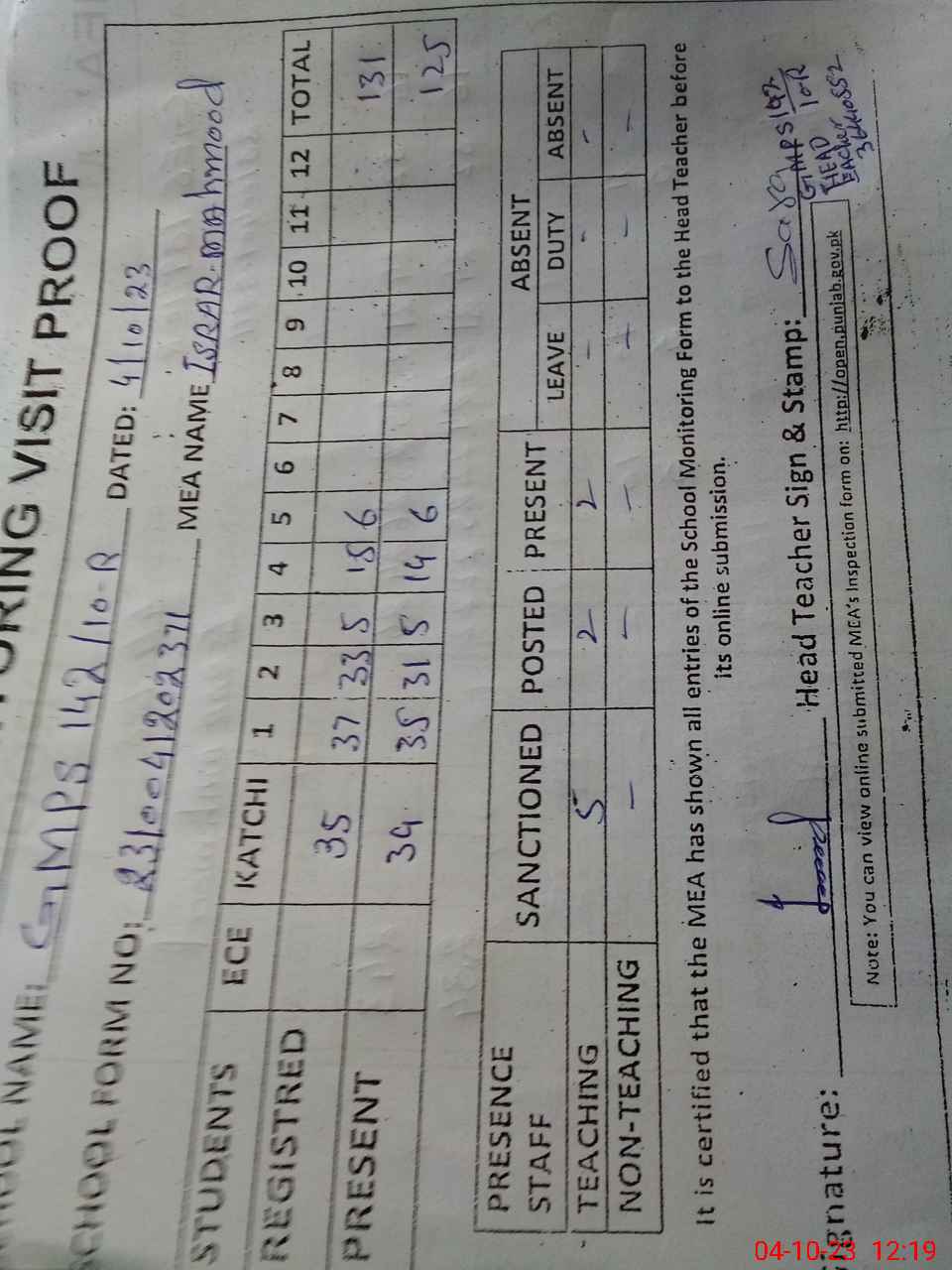 | Attendance Register | Head Teacher | MEA with School | Visit Proof |