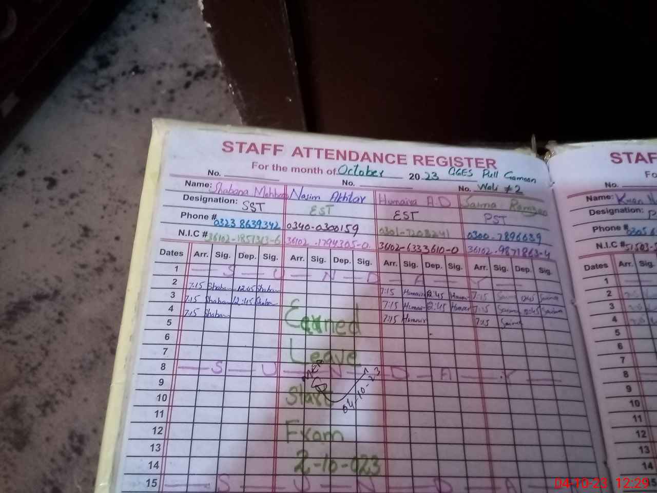 | CNIC | Full Name | Designation | R/C | Absence During Last Calender Month |