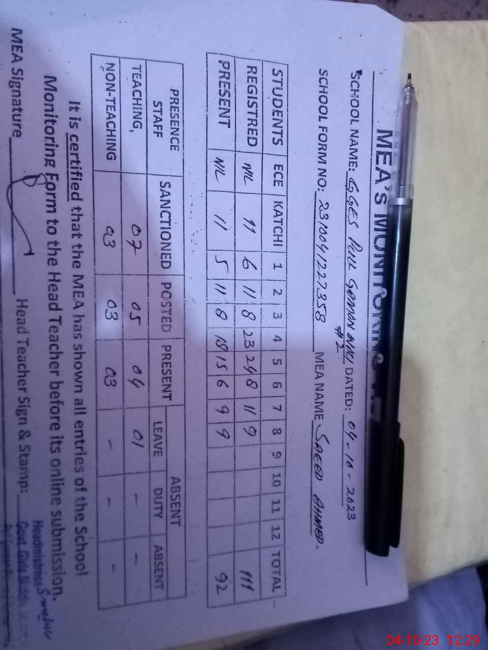 | Attendance Register | Head Teacher | MEA with School | Visit Proof |
