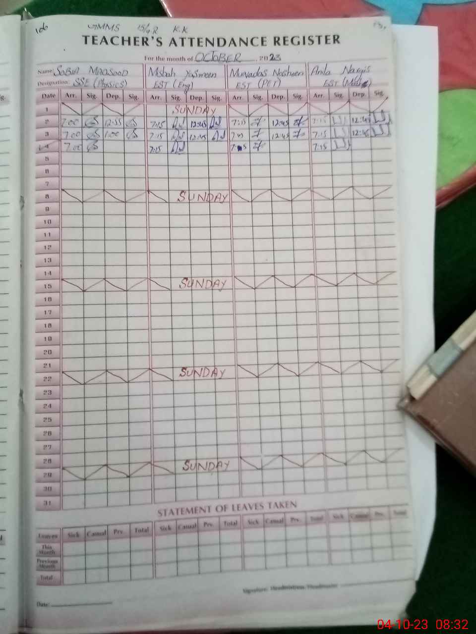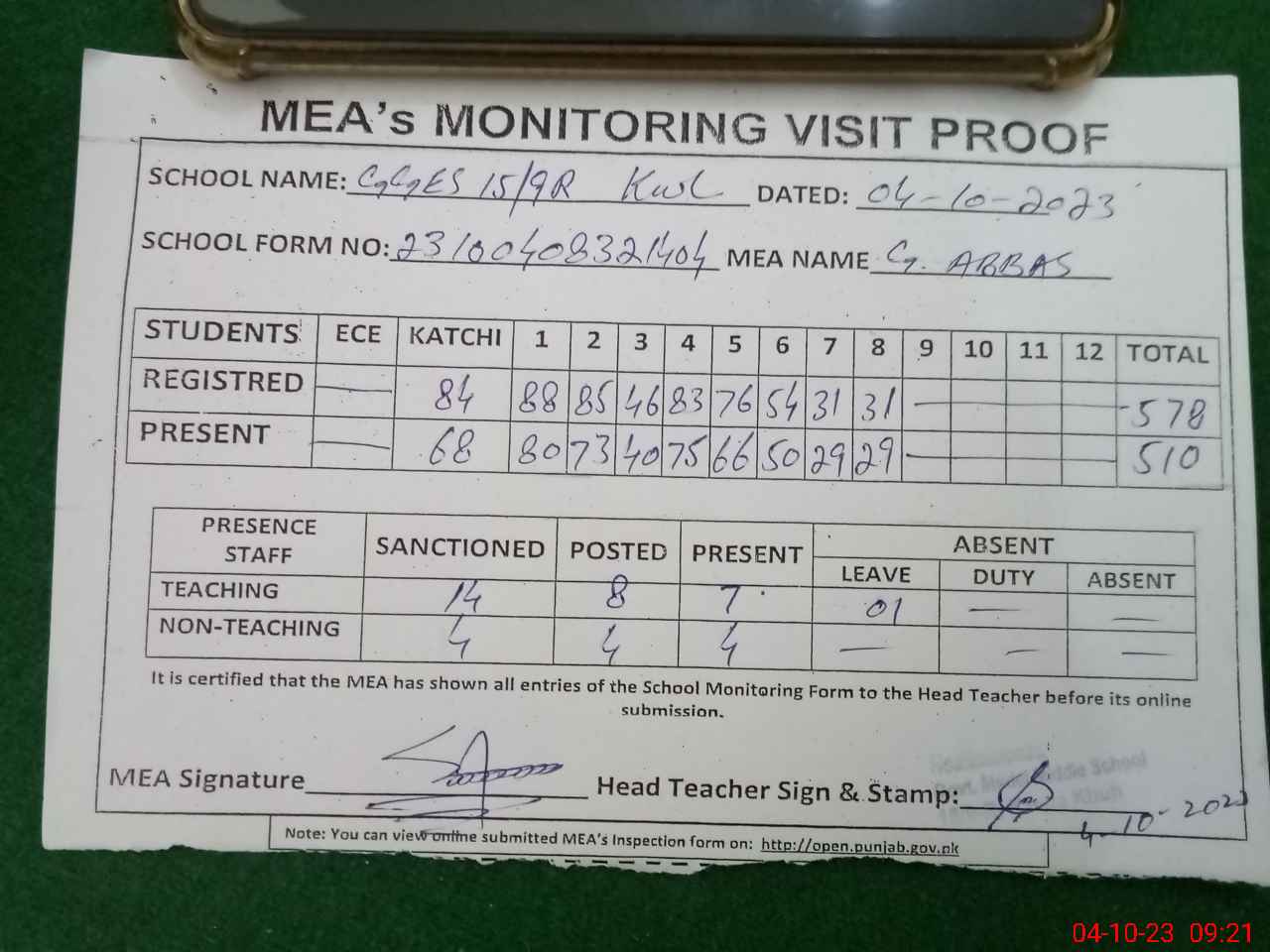 | Attendance Register | Head Teacher | MEA with School | Visit Proof |
