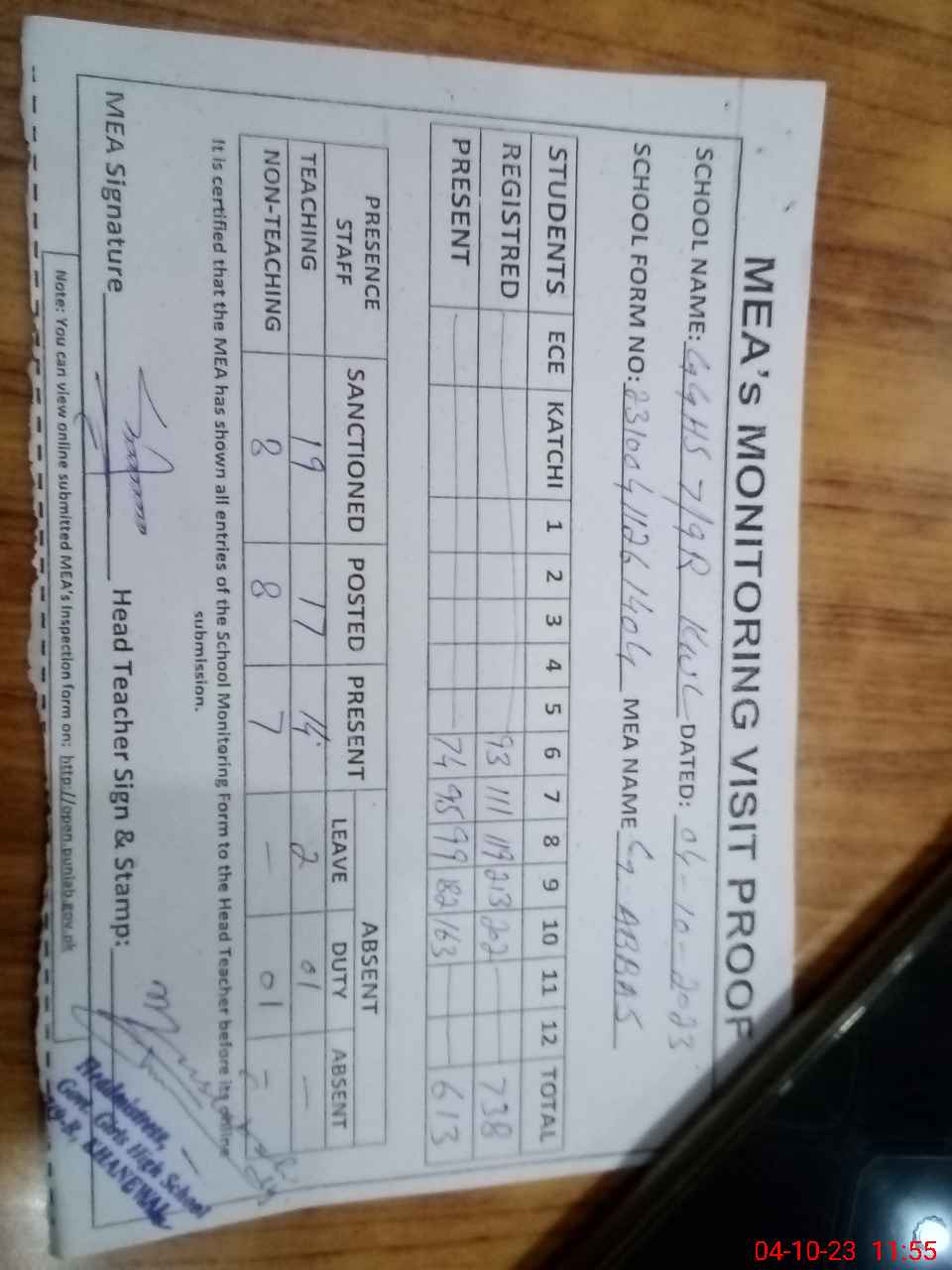 | Attendance Register | Head Teacher | MEA with School | Visit Proof |
