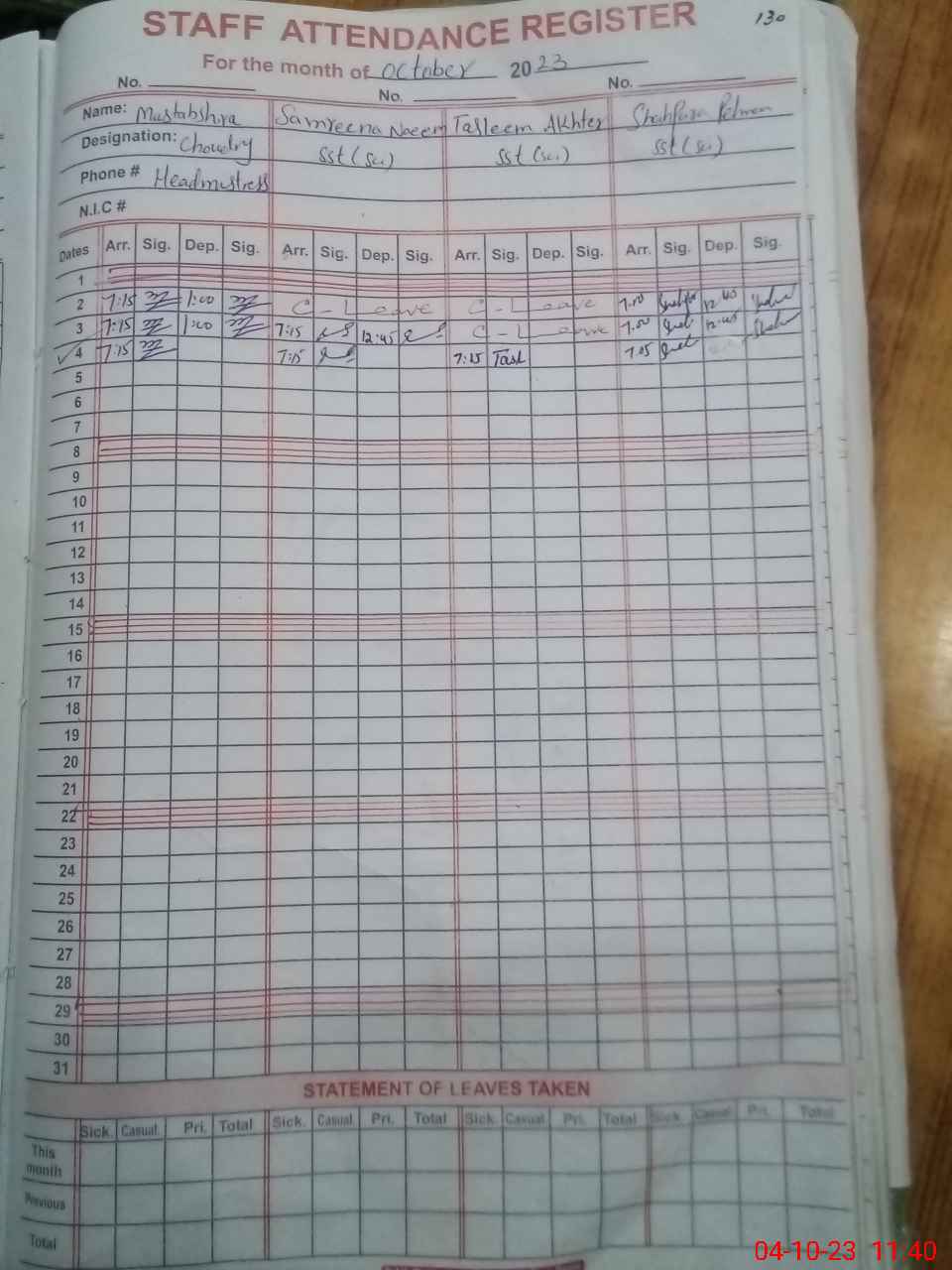 | CNIC | Full Name | Designation | R/C | Absence During Last Calender Month |