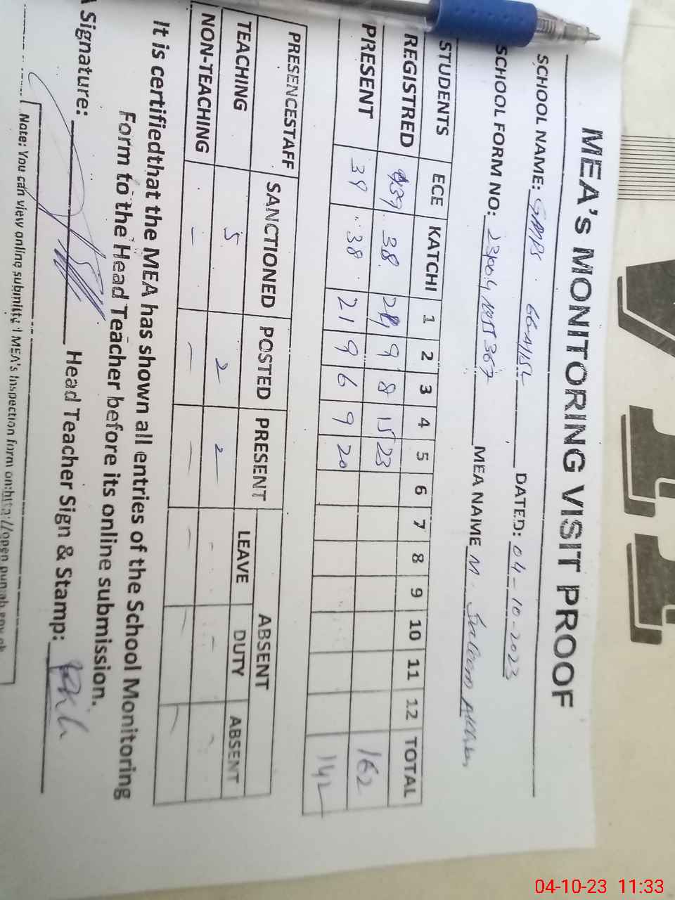 | Attendance Register | Head Teacher | MEA with School | Visit Proof |