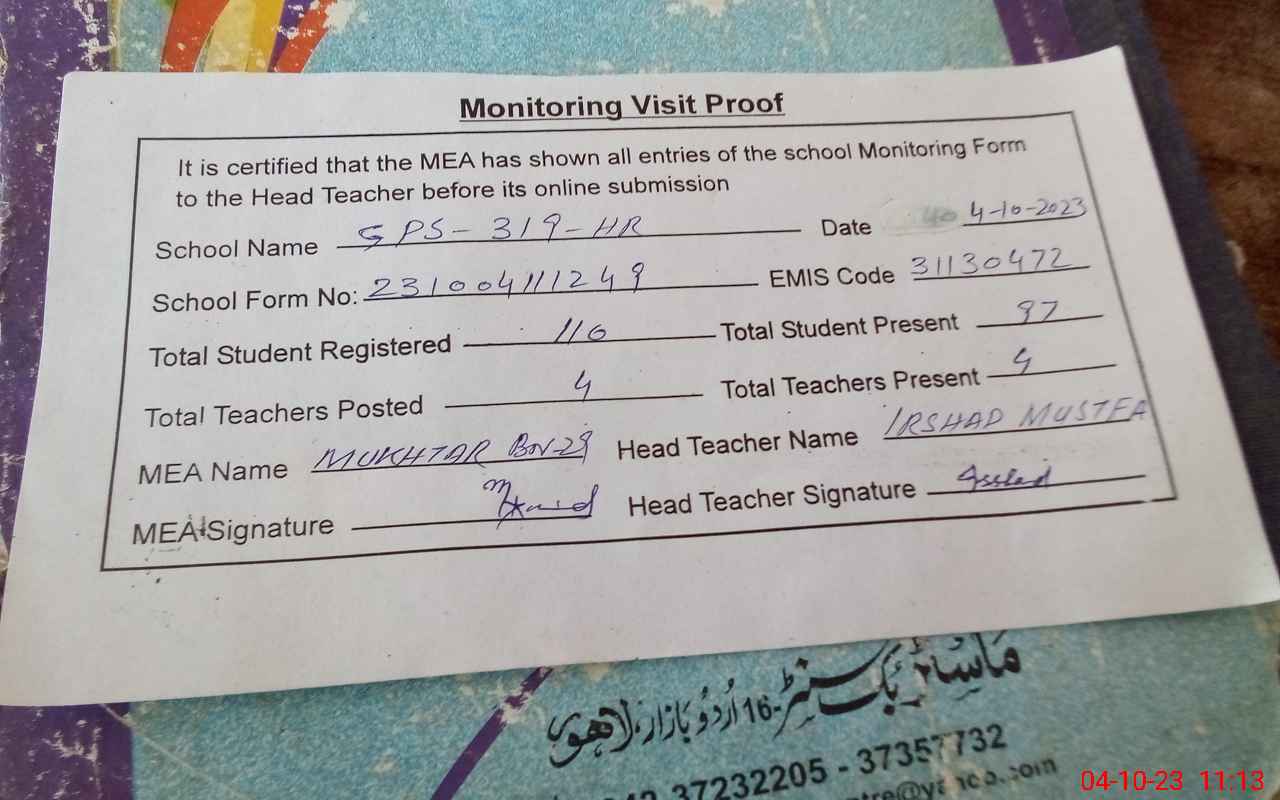| EMIS Code: 31130472 | Name of School: GPS CHAK NO 319/HR | |||