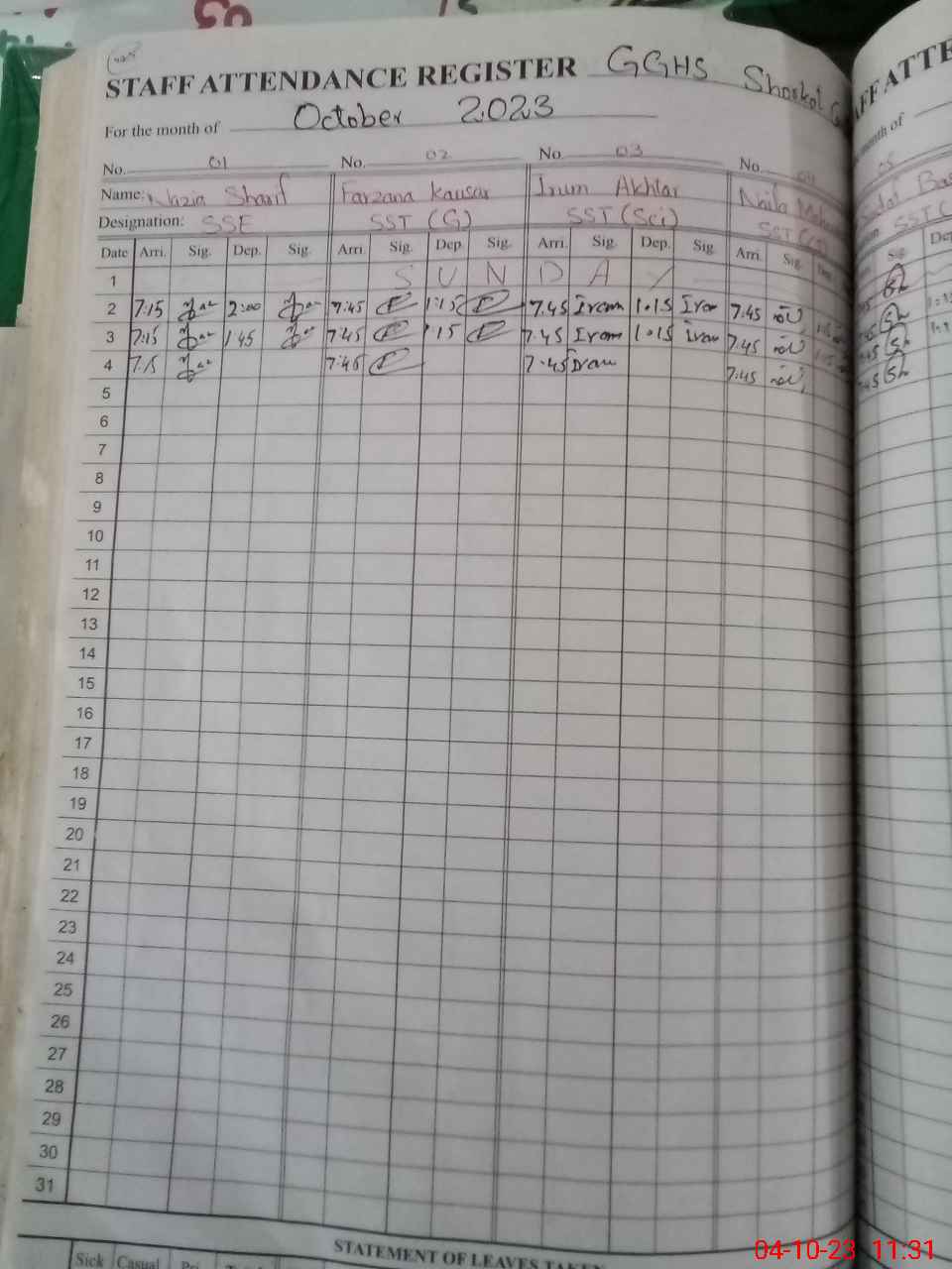 | 33**** | Sa**** Ko**** | 1 | 0 | 0 | 30 | 0 | 0 | 0 | 0 | 0 | 0 | Absent (Un-Authorized) | |