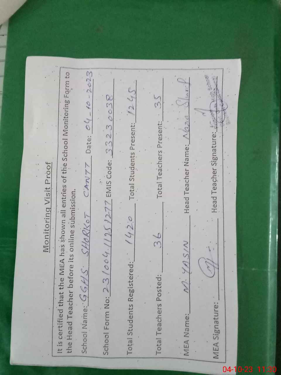 | Attendance Register | Head Teacher | MEA with School | Visit Proof |