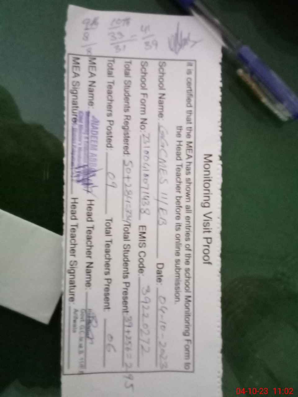 | Attendance Register | Head Teacher | MEA with School | Visit Proof |