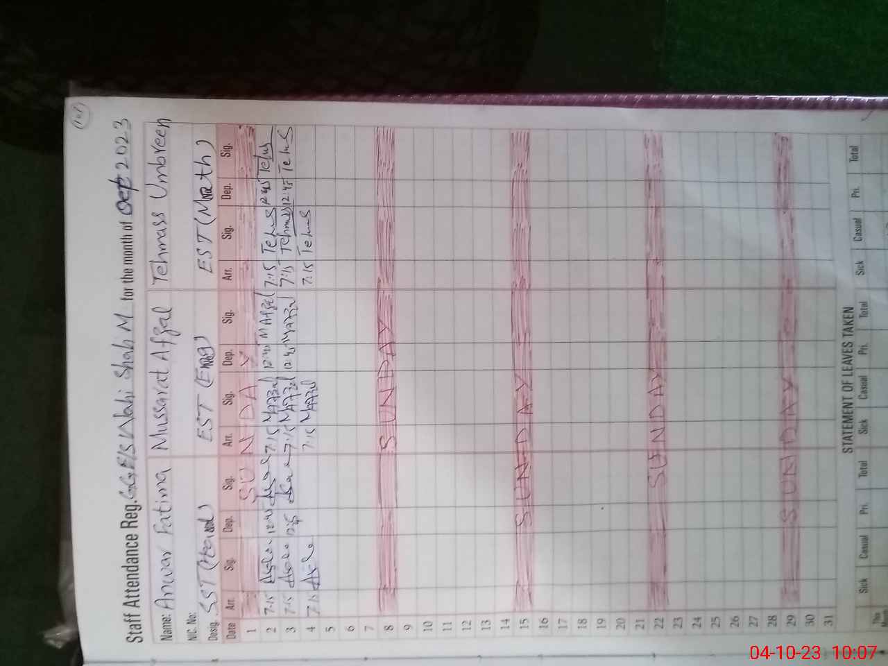 | Name: Ta**** Um**** Designation: (School Headmaster's/Headmistress's) EST Math Phone/Cell Number: 03**** |