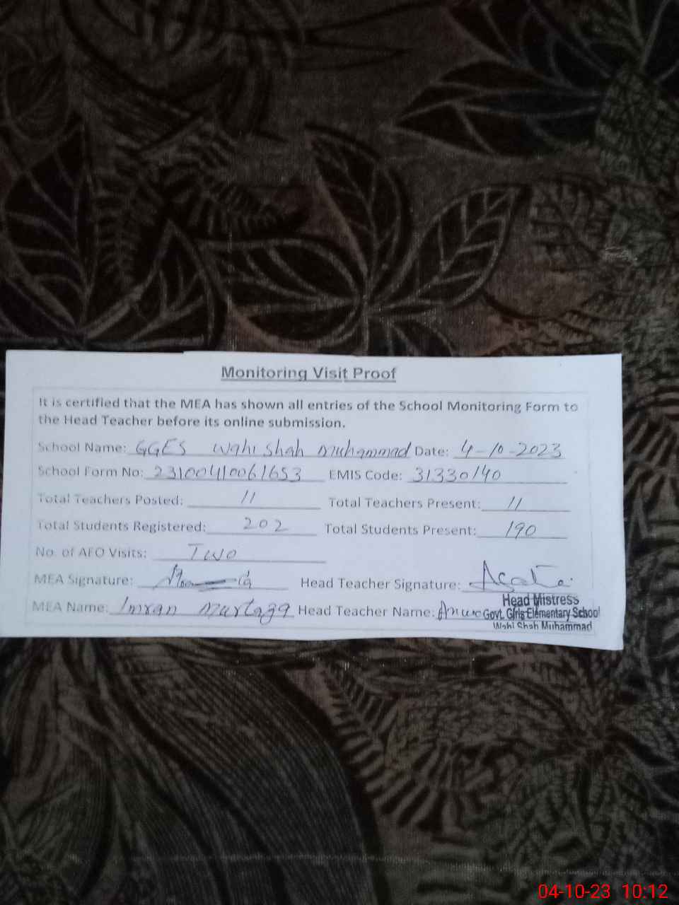 | Attendance Register | Head Teacher | MEA with School | Visit Proof |
