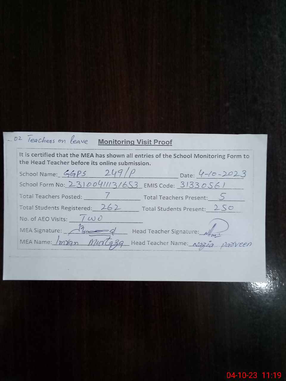 | EMIS Code: 31330561 | Name of School: GGPS CHAK NO. 249/P | |||