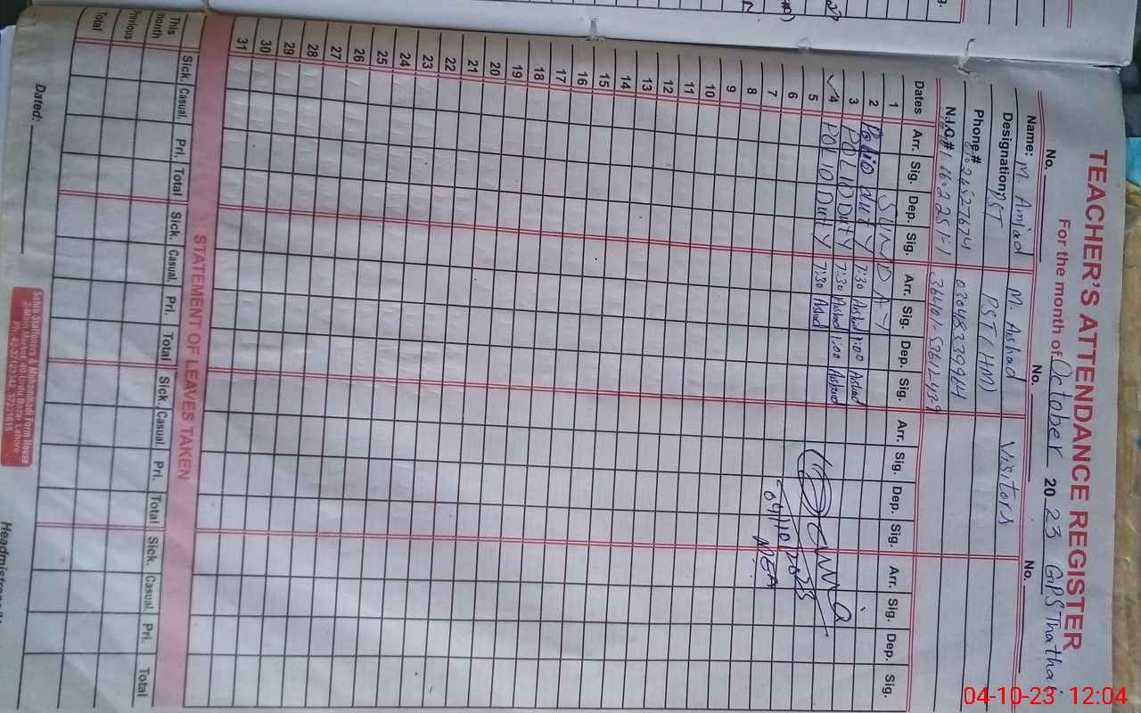 | Name: MU**** AR**** Designation: (School Headmaster's/Headmistress's) PST Phone/Cell Number: 03**** |