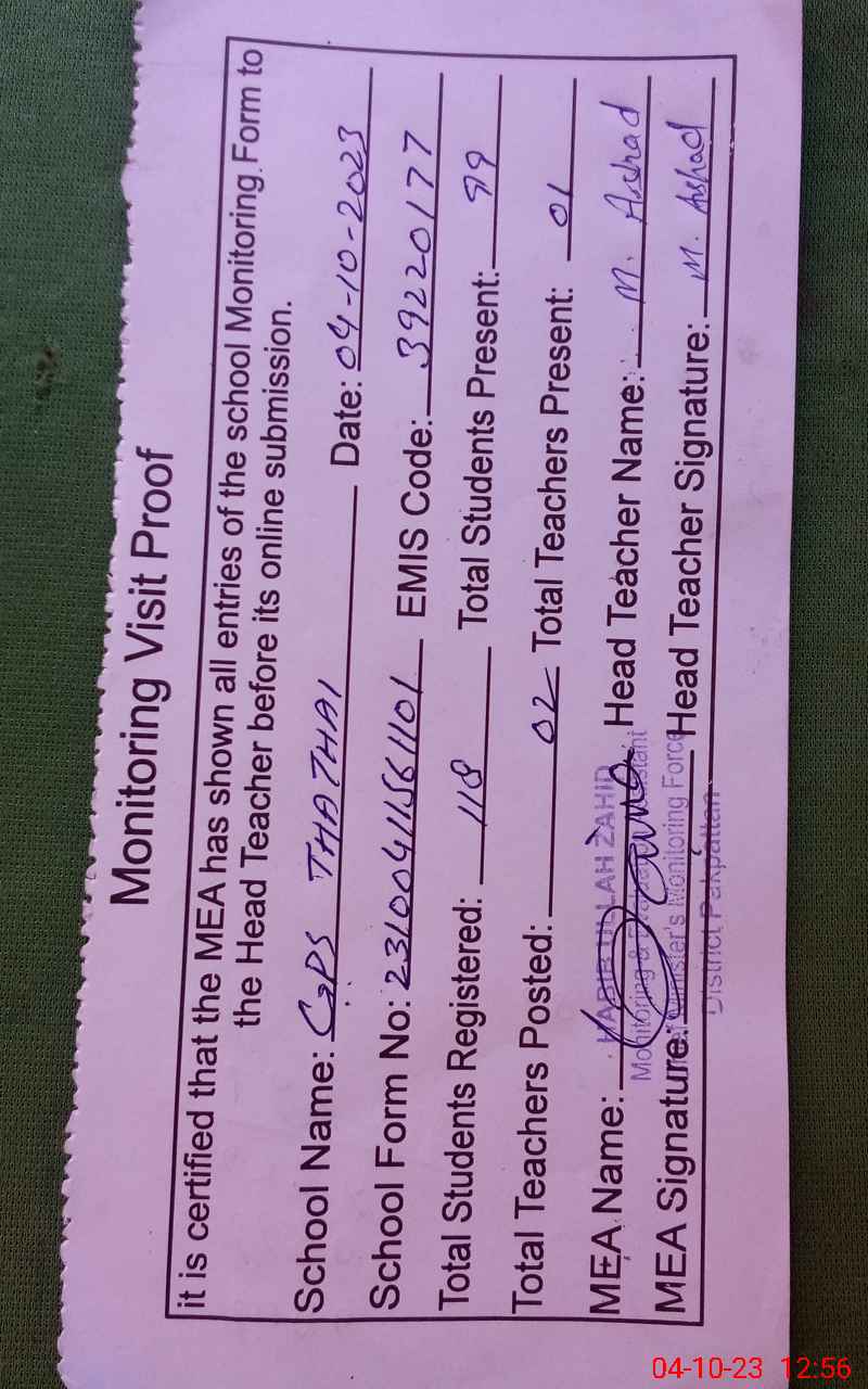 | EMIS Code: 39220177 | Name of School: GPS THATHAI P/O SAME TEH ARIF WALA | |||