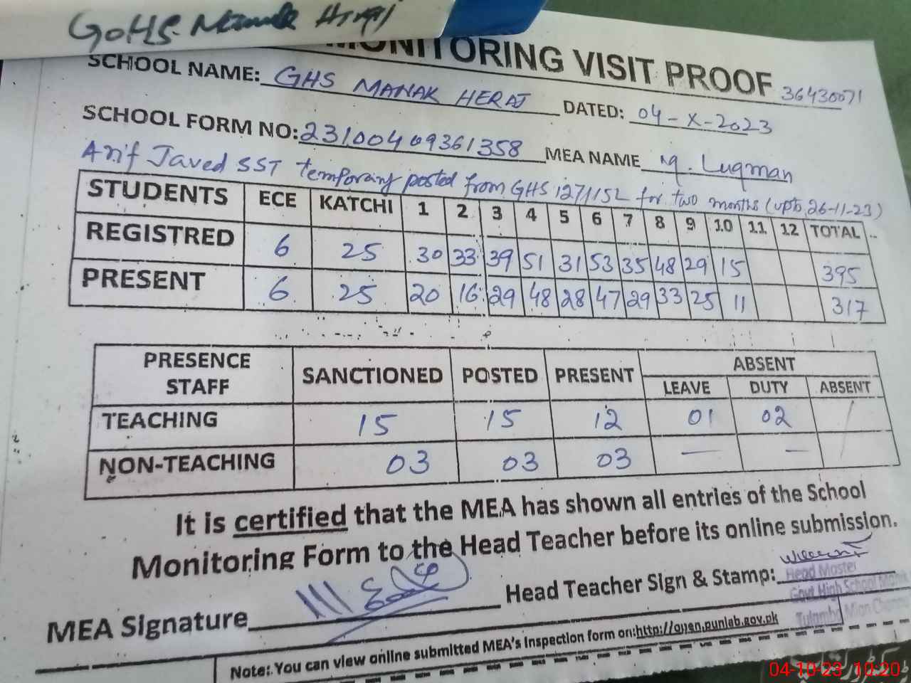 | EMIS Code: 36430071 | Name of School: GHS MANAK HERAJ, TULAMBA | |||