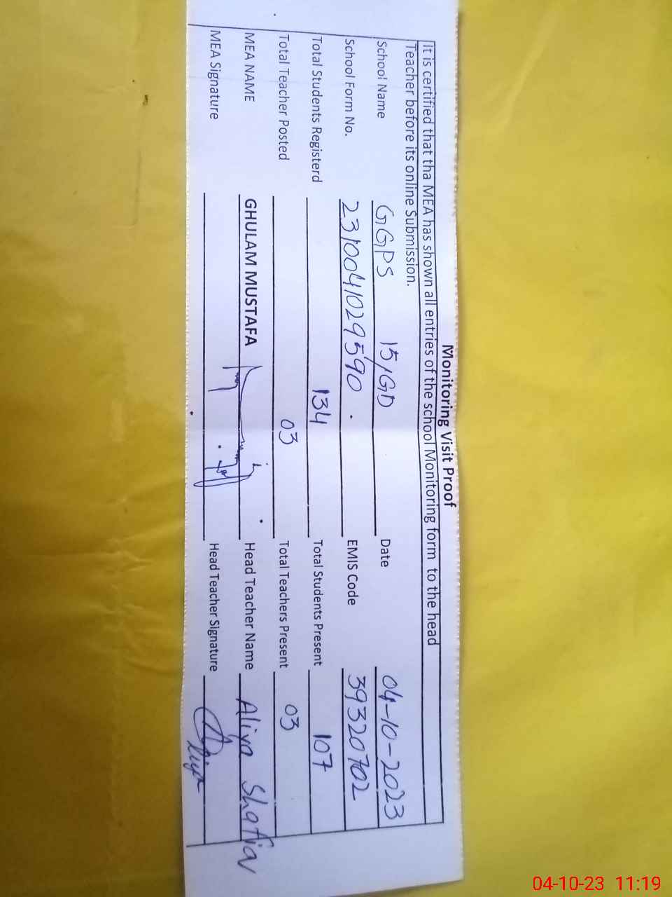 | EMIS Code: 39320702 | Name of School: GGPS CHAK NO.15/G.D | |||