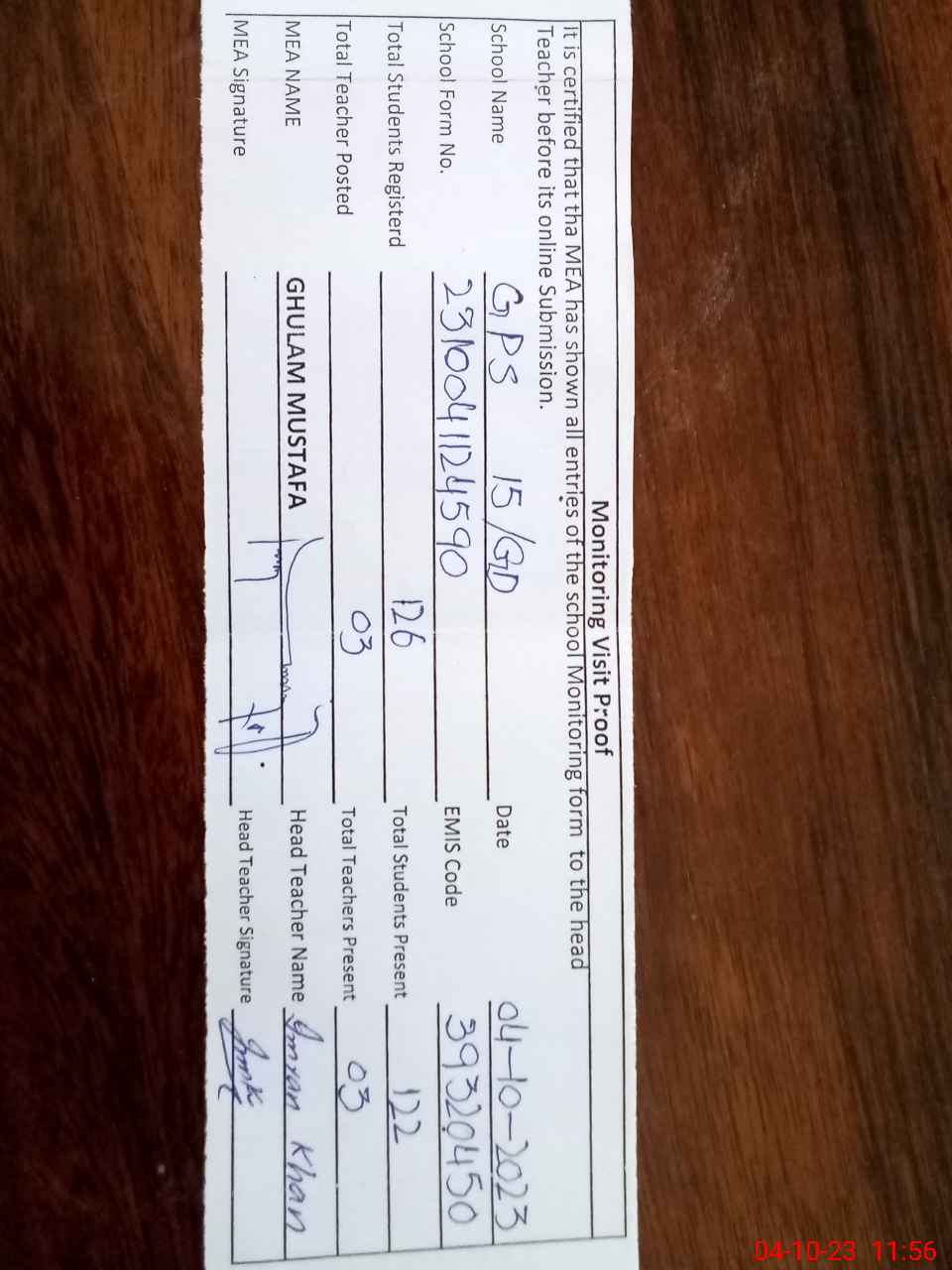 | EMIS Code: 39320450 | Name of School: GES CHAK NO. 15/G.D | |||