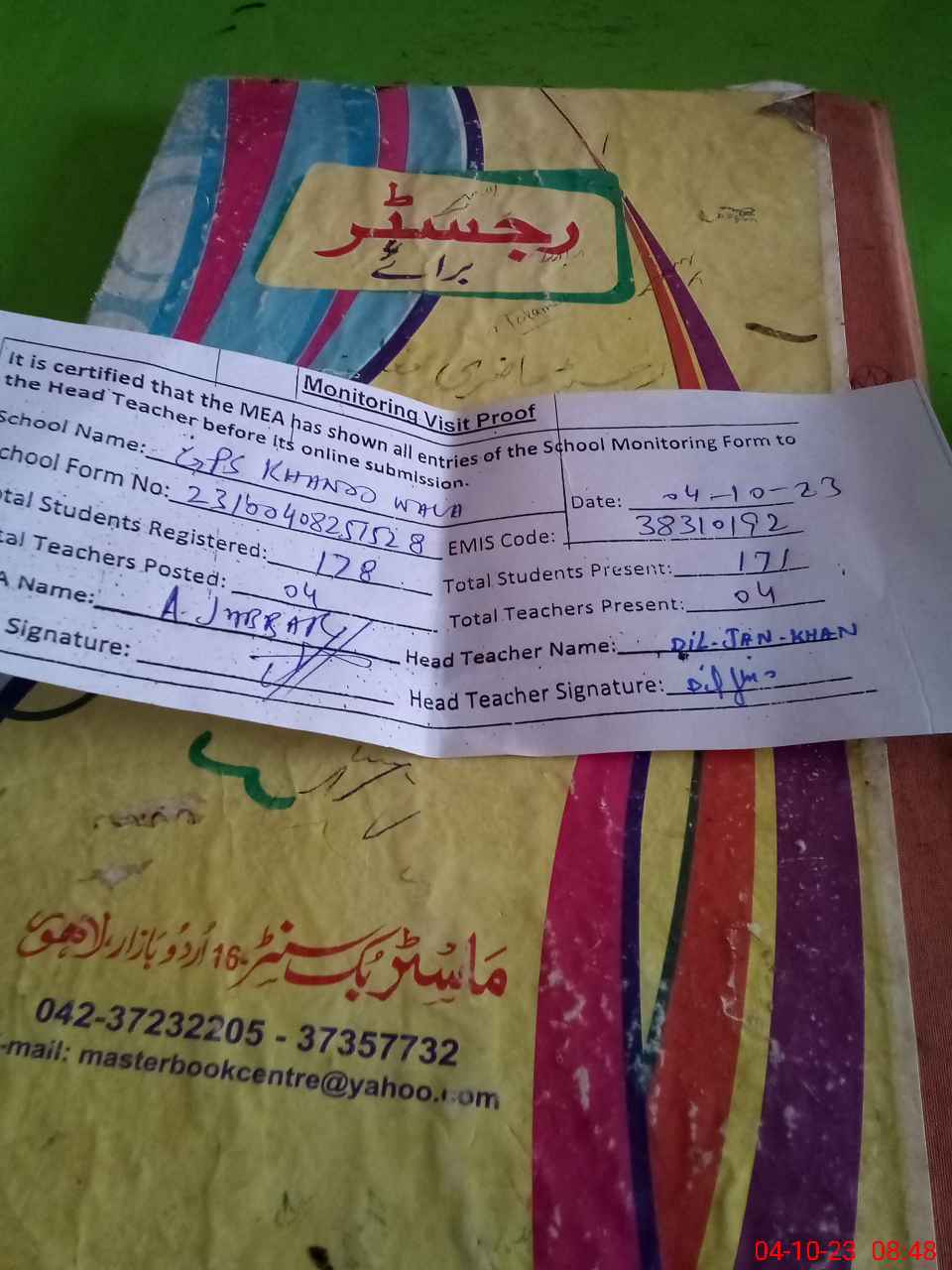 | Attendance Register | Head Teacher | MEA with School | Visit Proof |