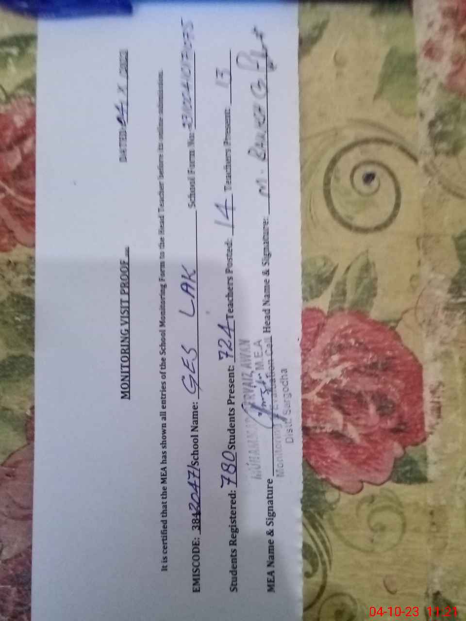 | Attendance Register | Head Teacher | MEA with School | Visit Proof |