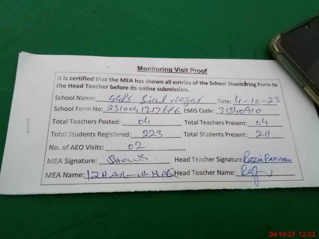 | Attendance Register | Head Teacher | MEA with School | Visit Proof |
