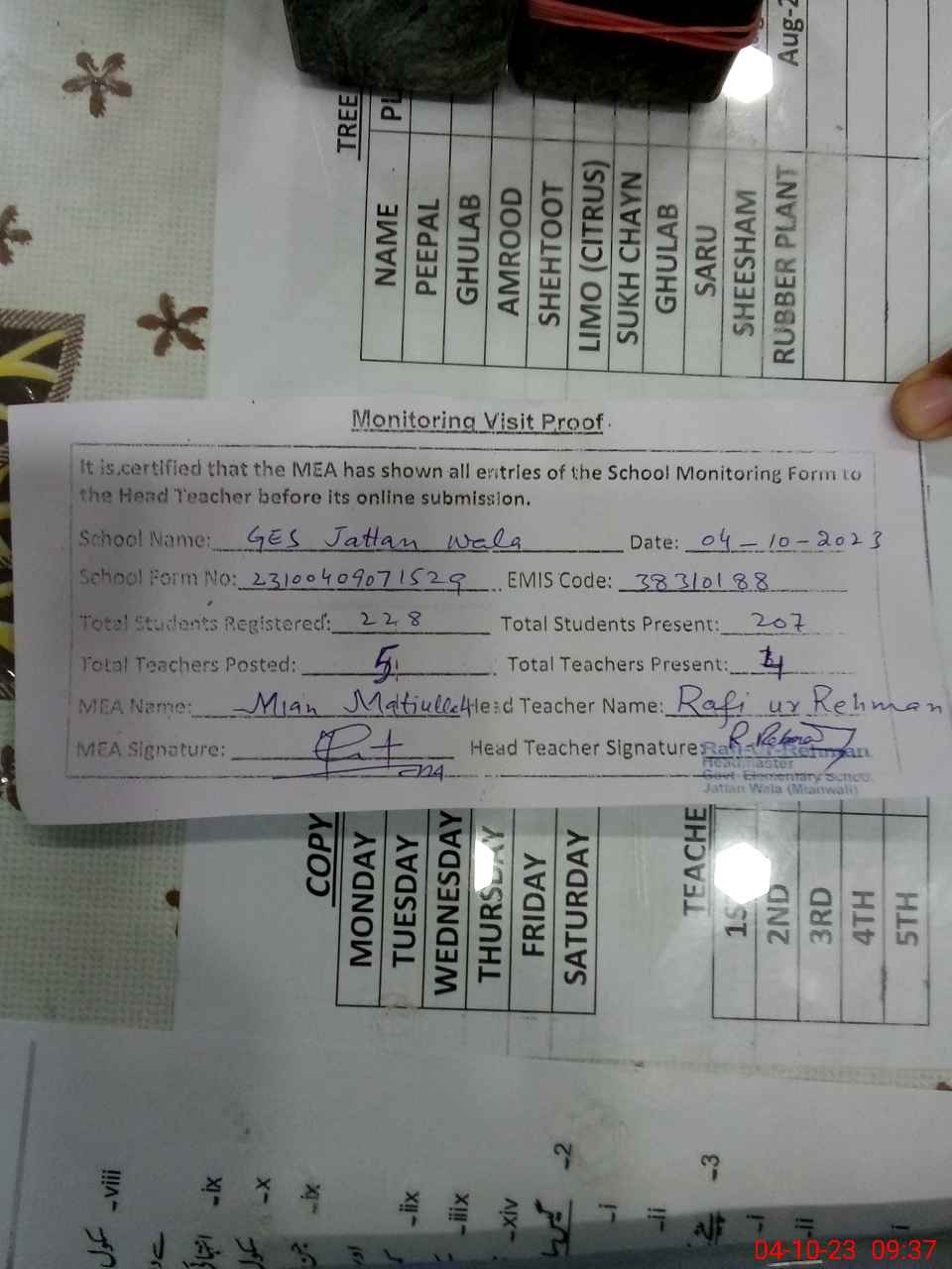 | Attendance Register | Head Teacher | MEA with School | Visit Proof |
