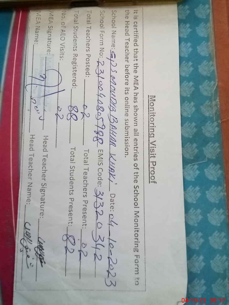| EMIS Code: 31320342 | Name of School: GPS MOADIB BAHAR KHAKHI | |||
