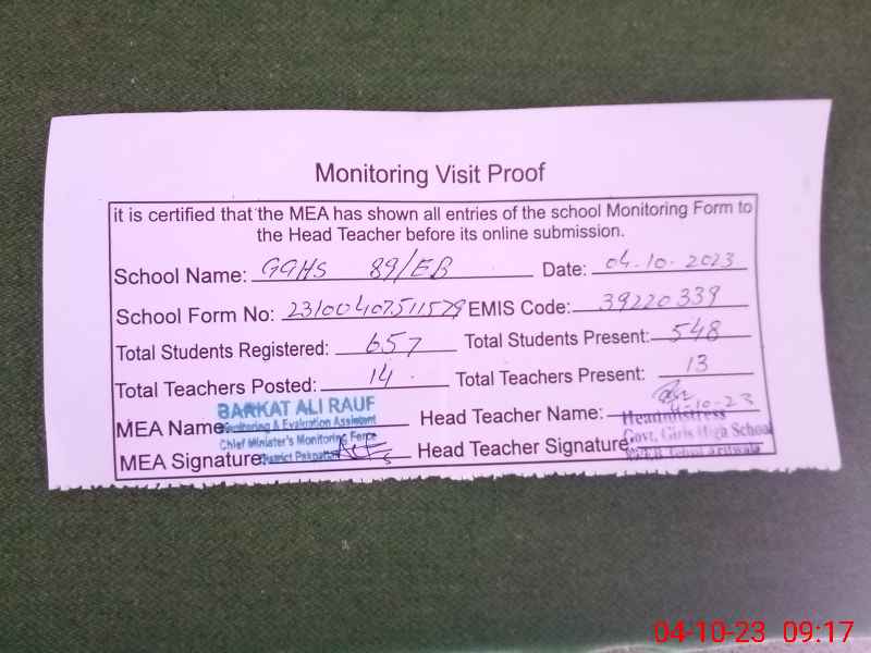 | EMIS Code: 39220339 | Name of School: GGHS 89/EB | |||