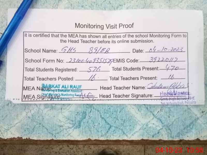 | EMIS Code: 39220117 | Name of School: GHS CHAK NO. 89 EB | |||