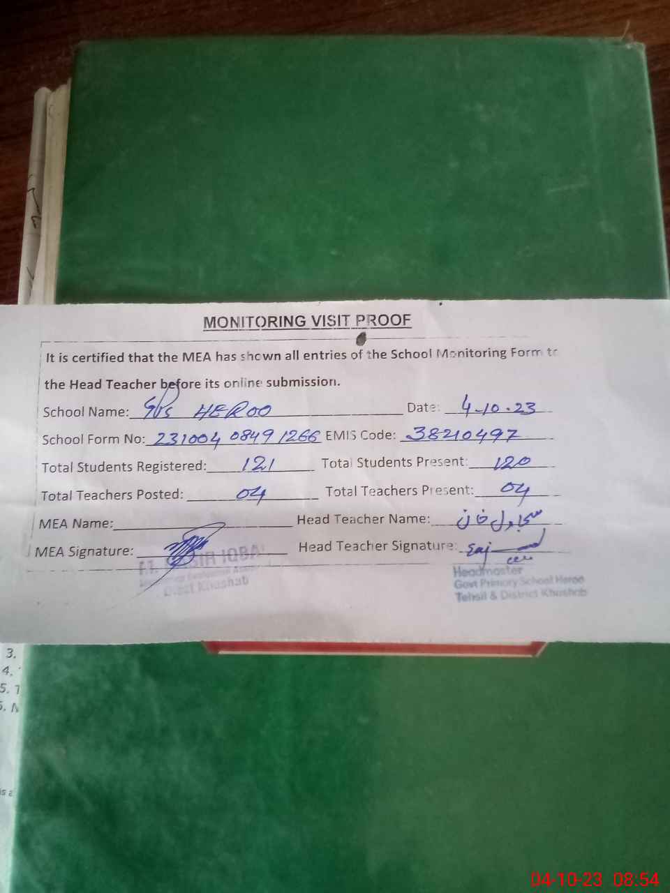 | Attendance Register | Head Teacher | MEA with School | Visit Proof |