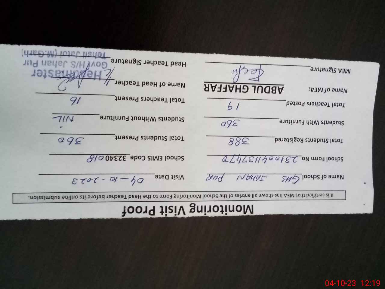 | Certified that this School was Inspected by the Undersigned MEA/DMO Today and the Information Stated Above is as Per Record. | |||||