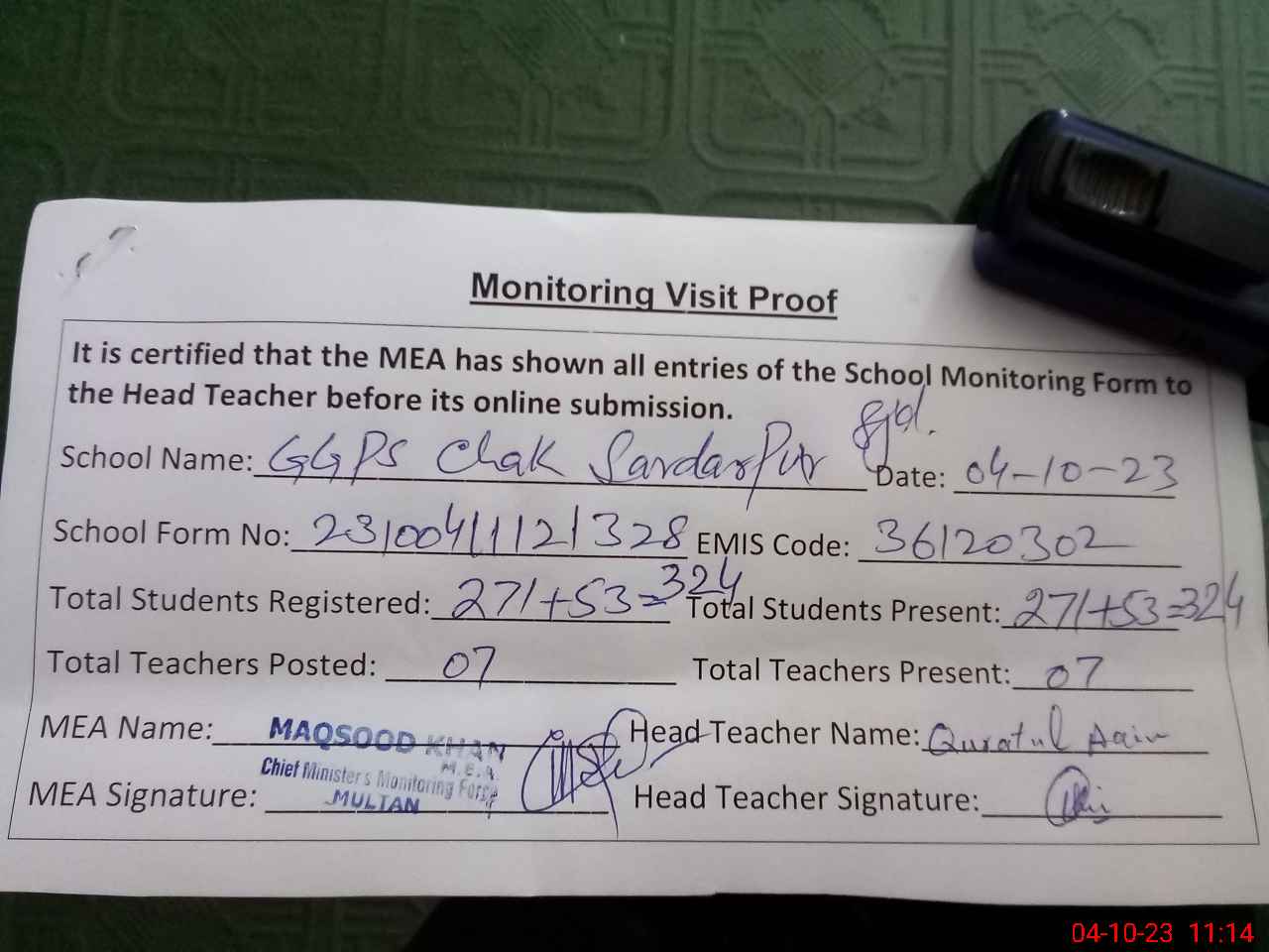 | Monitoring Date: 04-10-2023 | Start Time: 04-10-2023 11:03 AM | End Time: 04-10-2023 11:14 AM | Name of MEA: MA**** ULHA**** KH**** | |