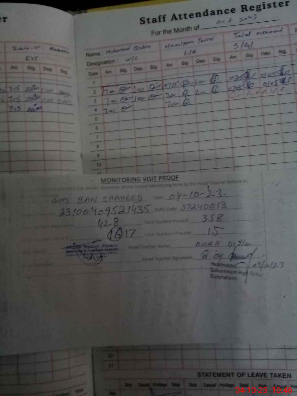 | Attendance Register | Head Teacher | MEA with School | Visit Proof |