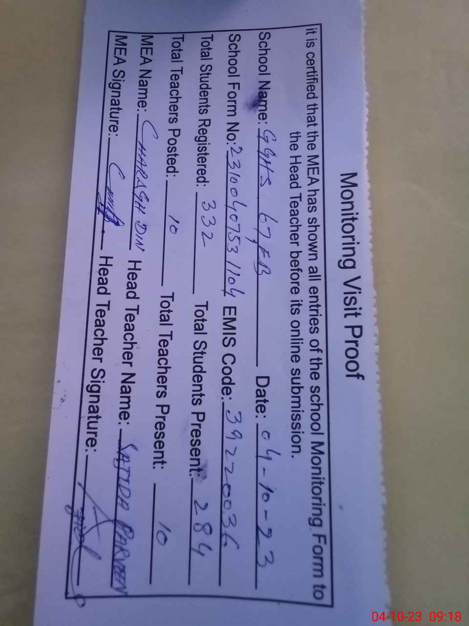 | EMIS Code: 39220036 | Name of School: GGHS 67 EB | |||