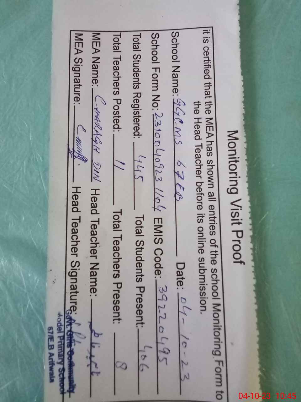 | Attendance Register | Head Teacher | MEA with School | Visit Proof |