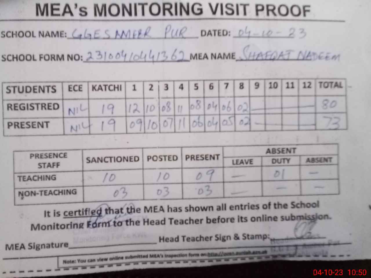 | Attendance Register | Head Teacher | MEA with School | Visit Proof |