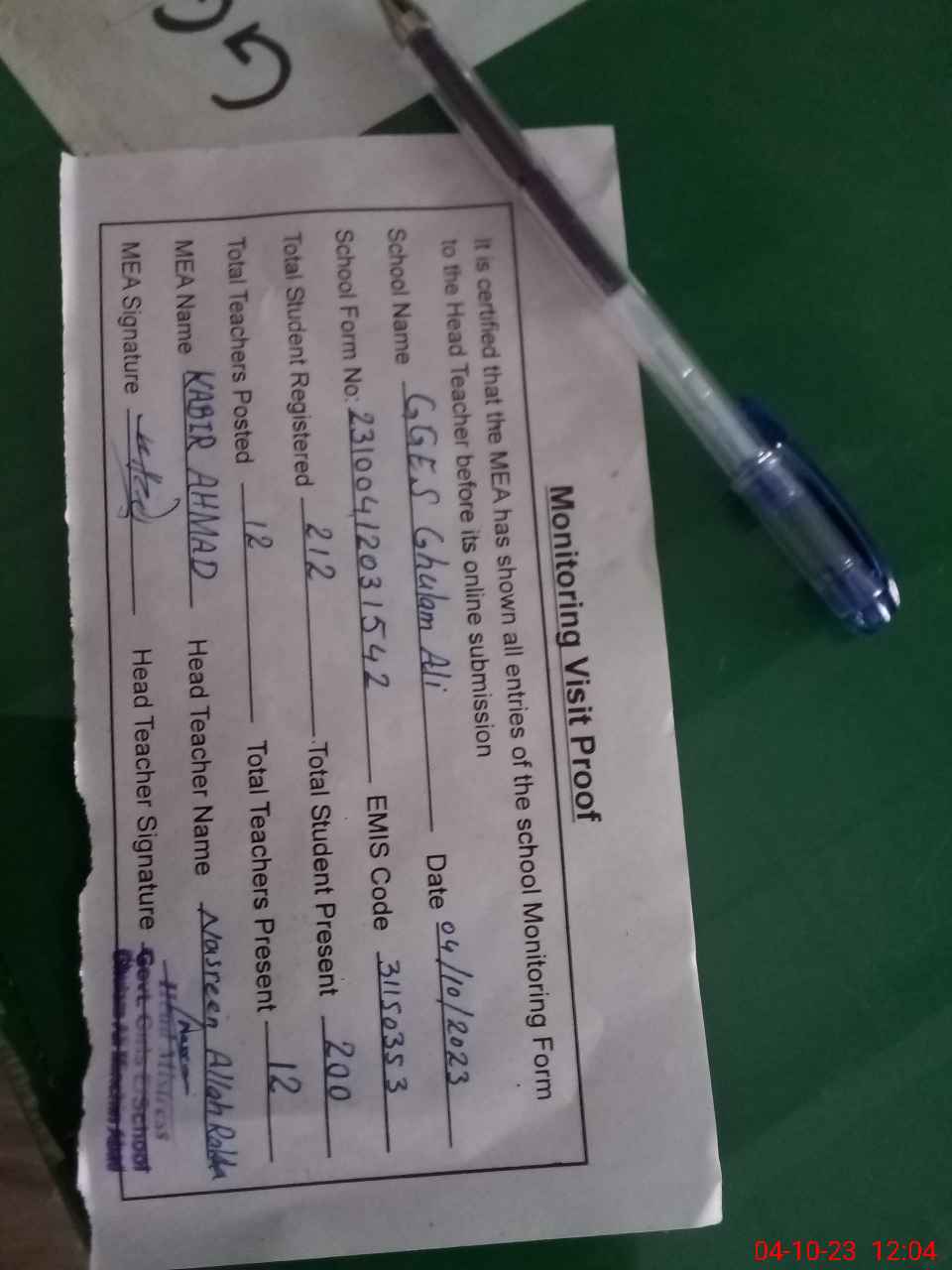 | Attendance Register | Head Teacher | MEA with School | Visit Proof |
