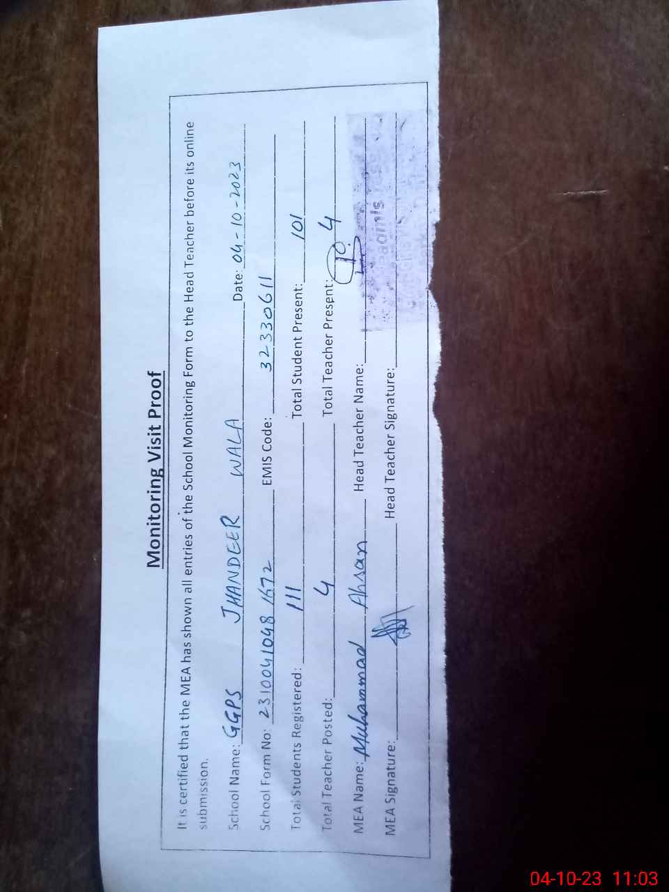 | EMIS Code: 32330611 | Name of School: GGPS JHANDEER WALA | |||