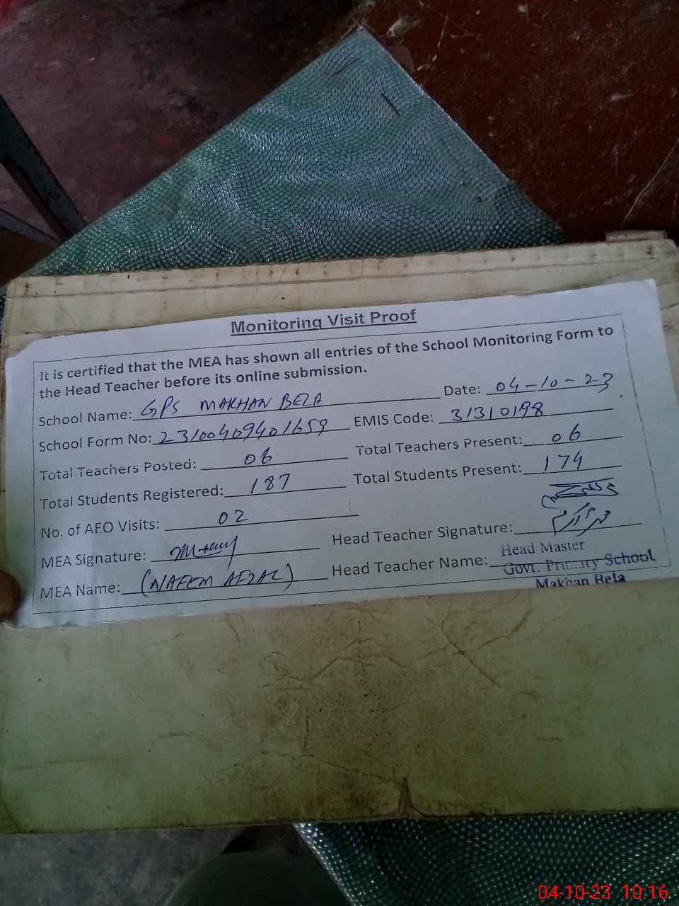 | EMIS Code: 31310198 | Name of School: GPS MAKHAN BELA (After Noon) | |||