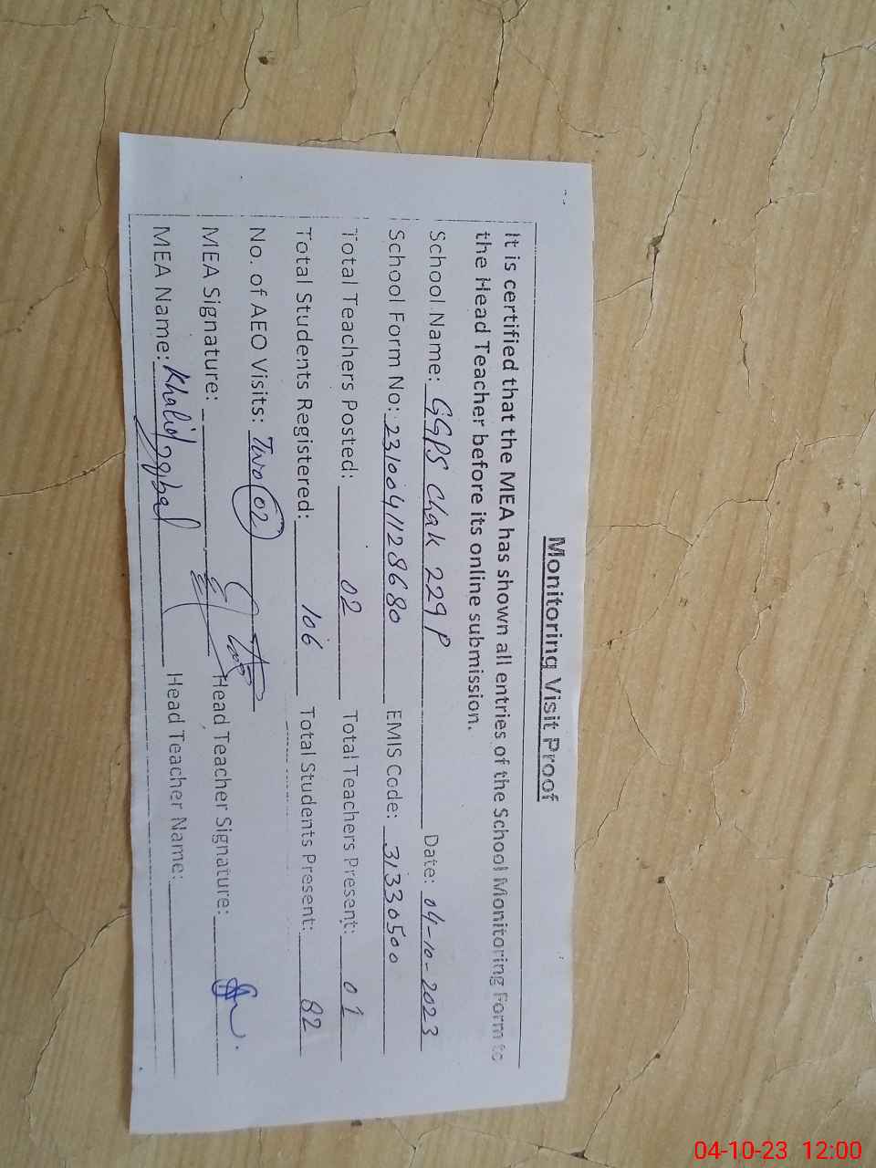 | Attendance Register | Head Teacher | MEA with School | Visit Proof |
