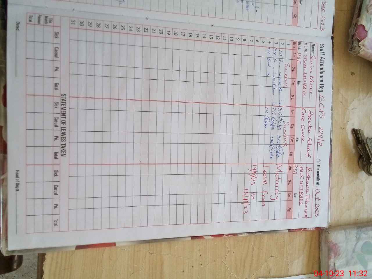 | 33**** | Ru**** Tu**** | 1 | 23 | 0 | 0 | 23 | 0 | 0 | 0 | 0 | 0 | Maternity | |