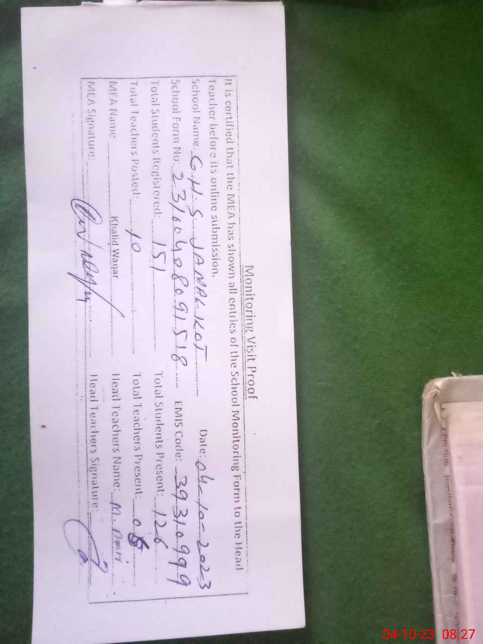 | Attendance Register | Head Teacher | MEA with School | Visit Proof |